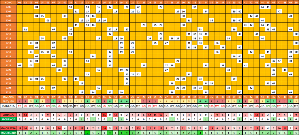 Com a tabela de comportamento, podemos observar a movimentação das dezenas sorteadas. Além disso podemos analisar também a frequência das dezenas, porcentagens, atrasos e sequências.